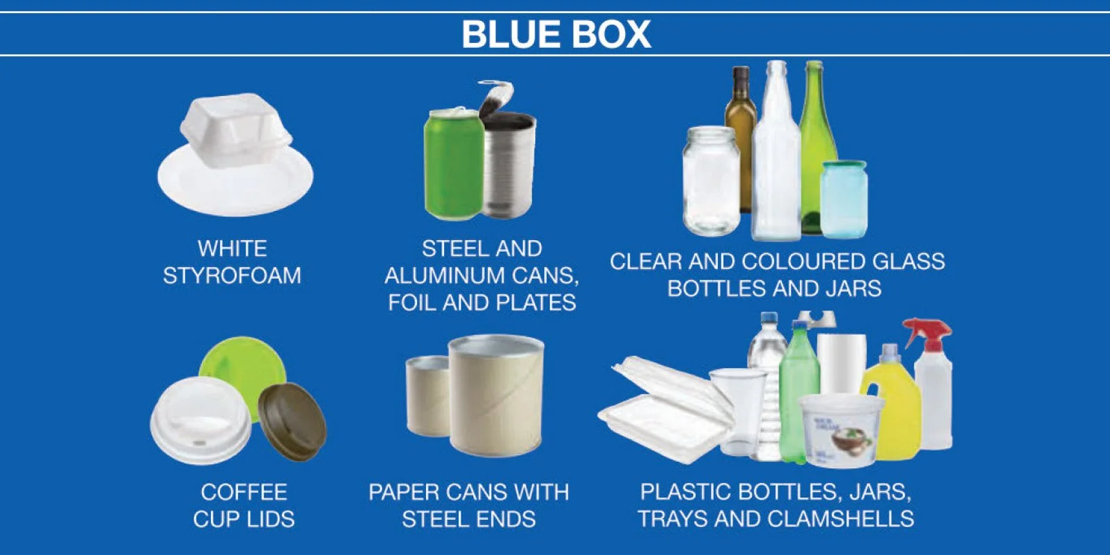 The blue box is for clean containers made of plastic, glass, and metal.